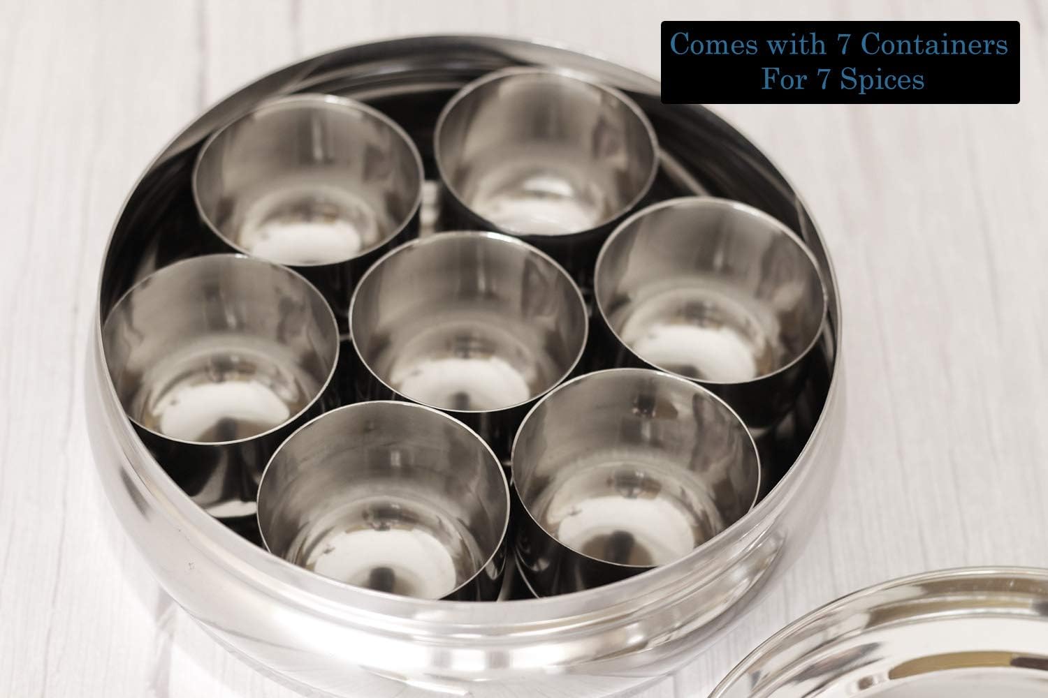 1. This Indian Masala Dabba Spice Container features 7 separate containers to store a variety of spices, along with a small spoon for easy measuring and serving. The metal tray is designed in a vibrant orange color, adding a pop of color to any kitchen decor. Perfect for organizing and storing different types of spices, this Masala Box is a must-have for any cooking enthusiast looking to add authentic Indian flavors to their dishes.