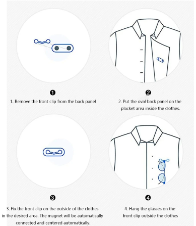 EASY TO USE: Simply place the clear back plate inside the desired article of clothing, and attach the metal front clip to the outside. Make sure it is smiling, do not let it frown. The magnets will automatically self-attach and self-center with ease. Then place your eyeglasses into the "V" of the metal front clip.