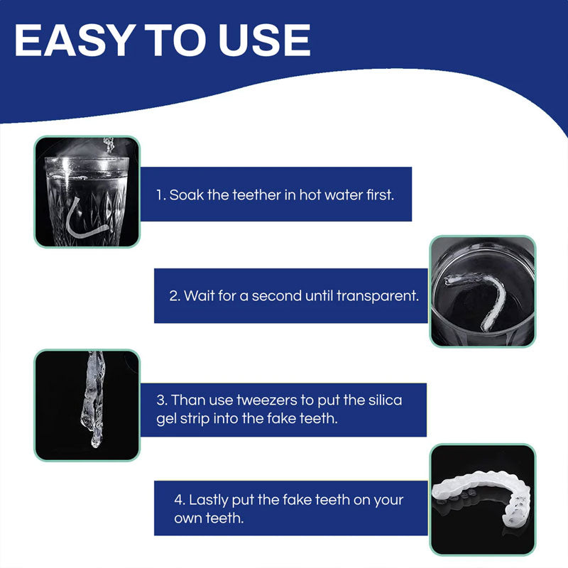 Place the teeth into a cup of hot, almost boiling water. This will make the veneers flexible and ready to wear.